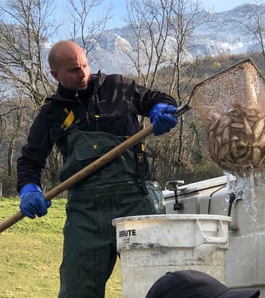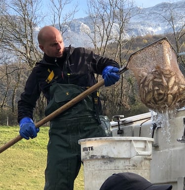 Passionné par les poissons, Jean-Raphaël Guérin a repris en 2021 la SARL Pisciculture Dombes Val de Saône, située à Farges-lès-Mâcon, au sud de Tournus.